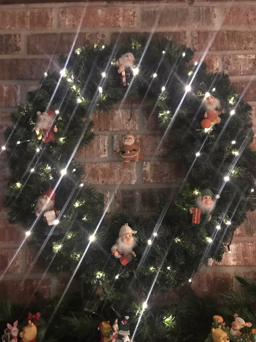 Next is our wreath over our fireplace. This is adorned with small elves that are older than 40 years. These were a decoration Ryan hung every year in his home growing up and when we moved in together they became a part of our holiday traditions. After more than 15 years we made a new wreath with pinpoint LEDs that makes the indoor scene look great!