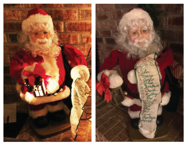 This Santa is something special for us. Years ago Ryan’s Aunt Cathy sent us this. It was one of those surprise, just out of the blue and every year it makes us smile and laugh. He’s 3 feet tall and moves around and is something people always notice. Jaxon talks to him all the time; just stands and talks to him. He takes on special meaning in 2019 because Aunt Cathy passed away after a long battle with cancer. She had the biggest heart, the smile that was always a little bit like she was plotting something, and the best aunt anyone could have asked for. We cherish our indoor memories with you, Aunt Cathy.